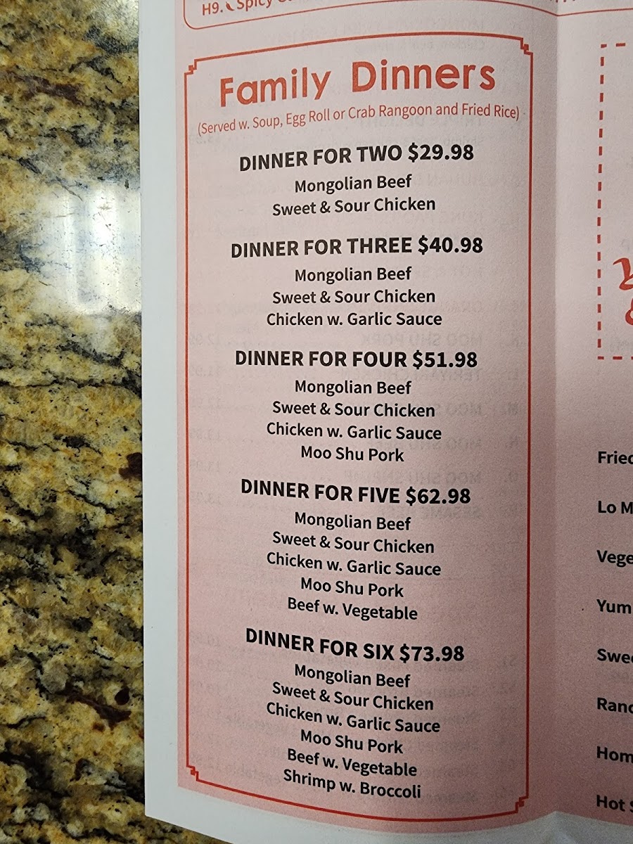 The menu at Yan Express offers a straightforward and inviting selection of Chinese dishes, perfect for casual meals whether dining in or taking out. The variety covers comforting staples like Lo Mein, with options ranging from Vegetable to House Special, alongside classic chicken entrees including both mild and spicy preparations.